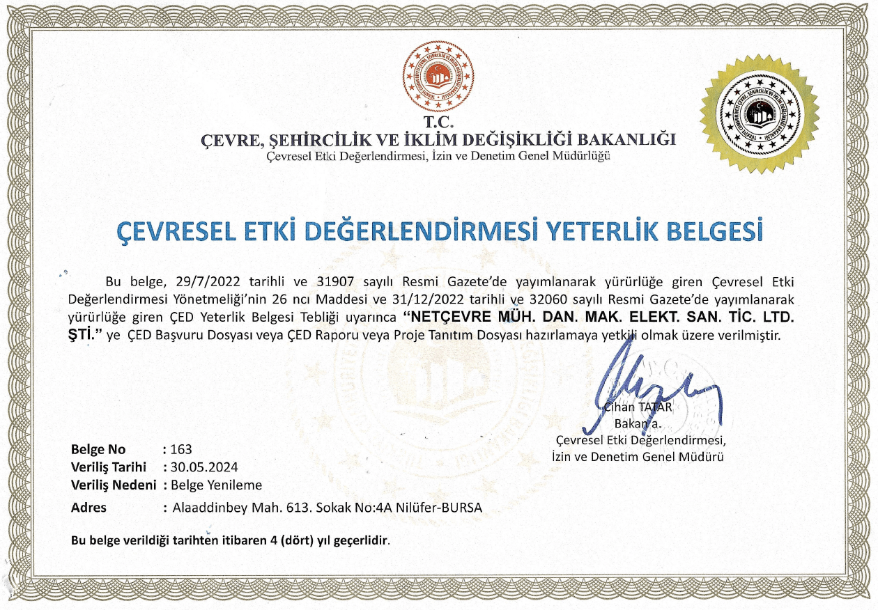 Netçevre, Çevre ve Şehircilik Bakanlığınca verilen ÇED Yeterlilik Belgesi kapsamında; ÇED Raporları, Proje Tanıtım Dosyası Hazırlama Çalışmalarını yürütmektedir.